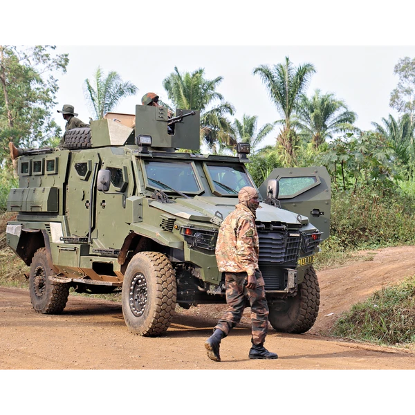 The lead picture spotlights the FARDC’s Kamaz-53949 Typhoon-K, a Russian-developed mine-resistant ambush-protected armoured vehicle, in the North Kivu province in 2025.